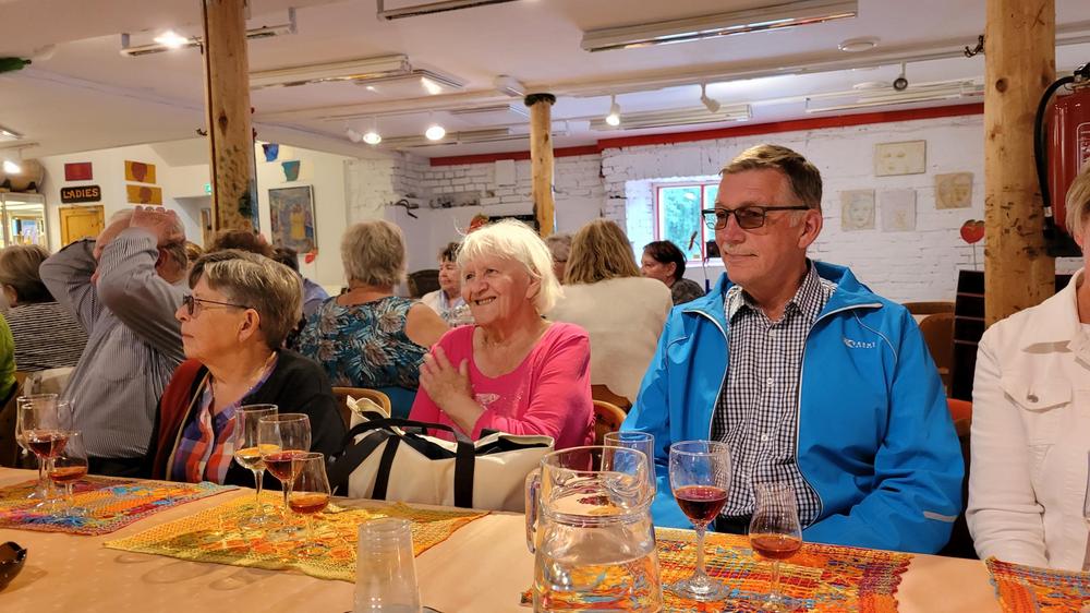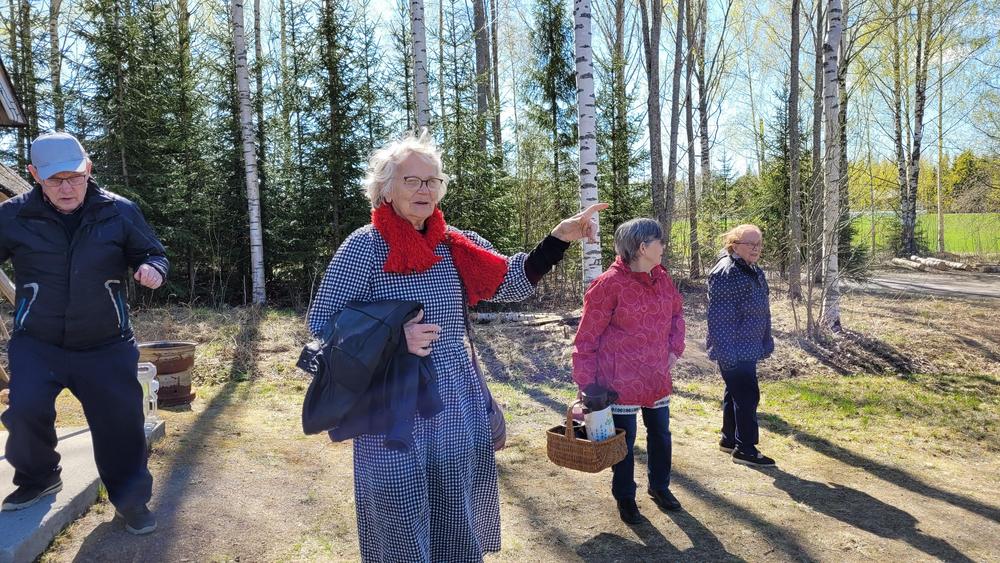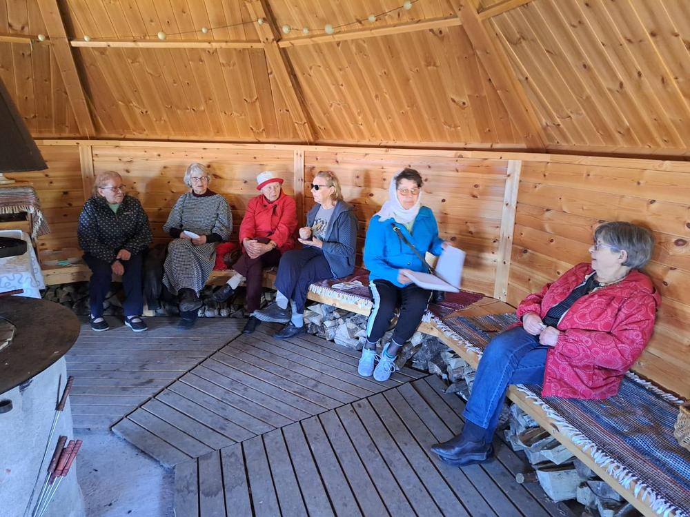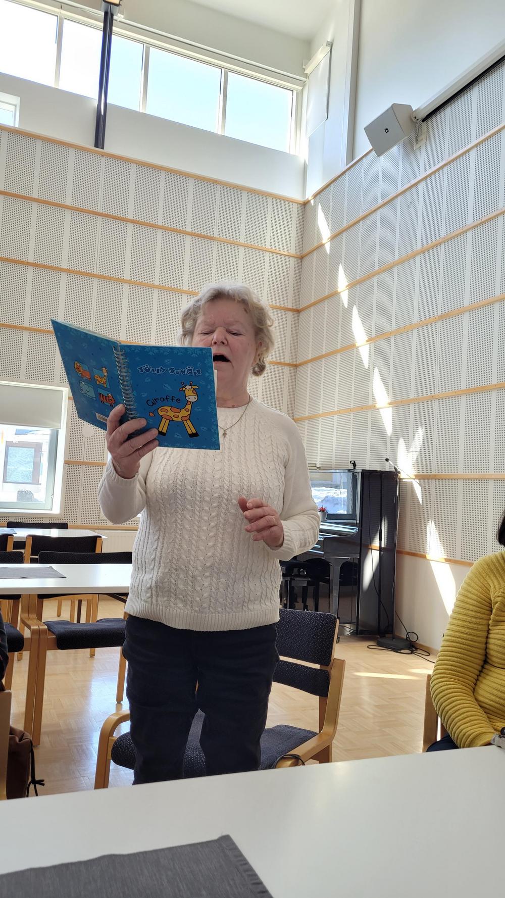 Yläpuolella Ritva Turunen viihdyttämässä eläkkeensaajia runoilla ja tarinoilla.